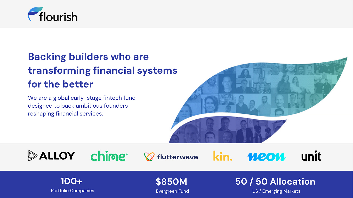 Flourish Ventures is an early-stage venture capital firm dedicated specifically to the financial technology sector. Spun out of the Omidyar Network, with backing from eBay founder Pierre Omidyar, the firm operates a sizable evergreen fund. This structure is a notable differentiator in the venture capital landscape, because returns are continuously reinvested in the fund rather than distributed and closed out on a strict timeline. This allows Flourish to take a longer-term view on their investments, which is essential when backing companies navigating highly regulated industries where policy and trust take time to develop.